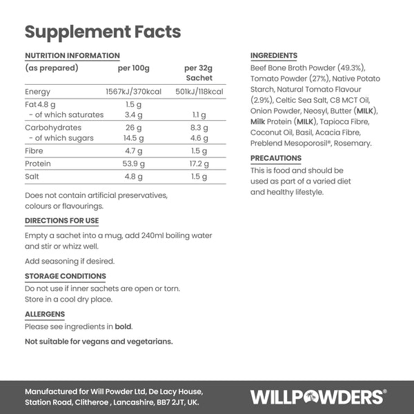 Instant, rich and creamy tomato bone broth soup – 17g of protein in every delicious mugful. Zero faff: tear, pour, stir. WillPowders meanz business!